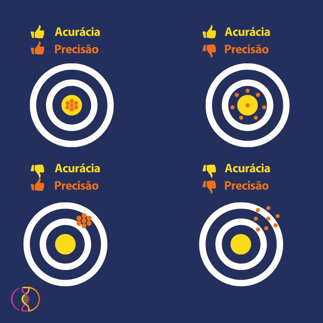 Já o termo termo ACURÁCIA é definido como exatidão de um valor obtido com relação a um valor tomado como referência. Ou seja, na acurácia, os resultados obtidos por uma experiência, por exemplo, não apenas podem ser precisos, mas também precisam estar perto do valor de referência ou valor real usado como base. Resumindo, medidas acuradas são aquelas cujo valor se aproxima do valor correto, ou seja, valor de referência.